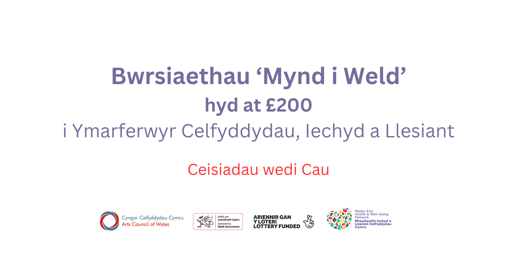 Mae’n bleser gan WAHWN allu cynnig nifer fach o fwrsariaethau er mwyn i artistiaid a gweithwyr proffesiynol sy’n gweithio yn y Celfyddydau, Iechyd a Lles gael ‘Mynd i Weld’ prosiectau eraill, mannau o ddiddordeb, cyfarfod â phartneriaid a chydweithwyr newydd, cefnogi costau hyfforddiant, mynychu cynadleddau neu wyliau celfyddydau ac iechyd. Yn y rownd hon, bydd canran o’r bwrsariaethau’n cael eu neilltuo ar gyfer ymarferwyr y Gymraeg, mwyafrif byd-eang ac ymarferwyr Byddar/Anabledd, sydd wedi’u tangynrychioli mewn ceisiadau hyd yma.